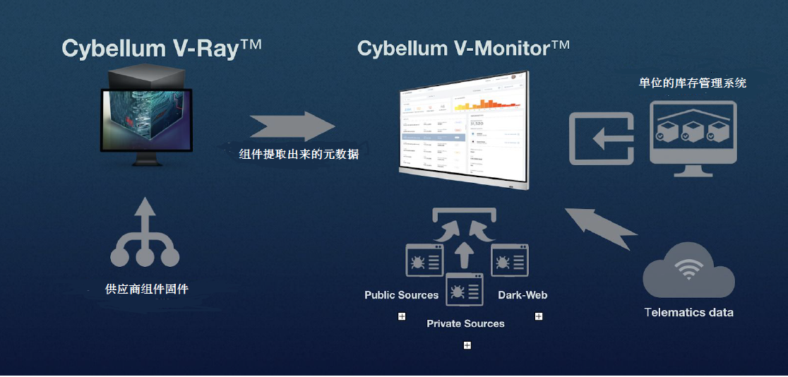 Cybellum V-Monitor集成到您的标准资产管理系统中,以检索资产记录的信息{ECU,软件版本,VIN,型号,相关部位}。使用此信息(或部分信息),Cybellum V-Monitor将新漏洞的数据和威胁情报与道路上的相关车辆相对应。